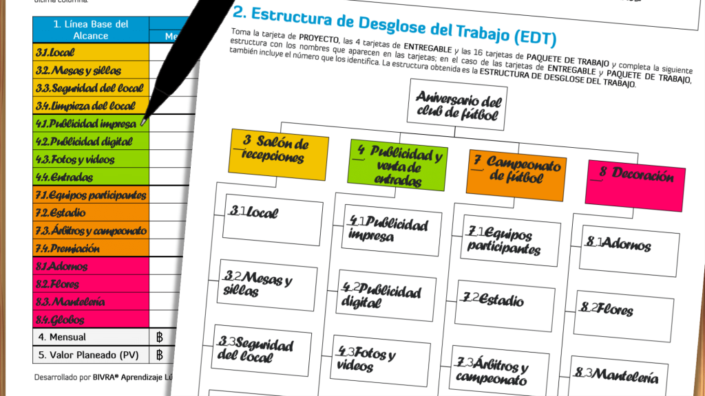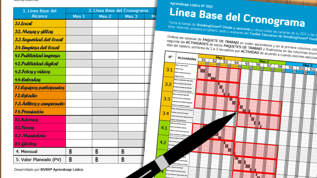 En la sesión de clase jugarán “Al Filo del Presupuesto” en su versión para 2 jugadores o 2 equipos. Para ello, deberán seleccionar una tarjeta de PROYECTO, junto con sus 4 tarjetas de ENTREGABLE, 16 tarjetas de PAQUETE DE TRABAJO y 64 tarjetas de ACTIVIDAD. Antes de iniciar, es necesario haber desarrollado las 3 Líneas Base del Proyecto: