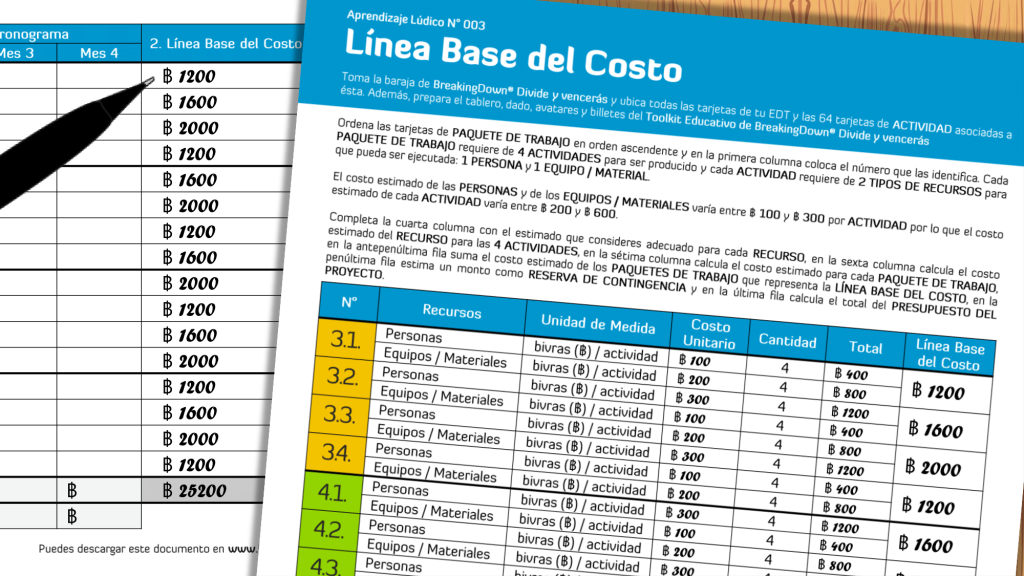- Descargar el TOOLKIT EDUCATIVO de BreakingDown® Divide y vencerás y preparar el Tablero, Avatares, Billetes, Dado de Tiempo, Dados de Costos (para equipos preparar estos elementos por duplicado, excepto los dados) e imprimir una Plantilla AL005 por cada alumno o equipo.