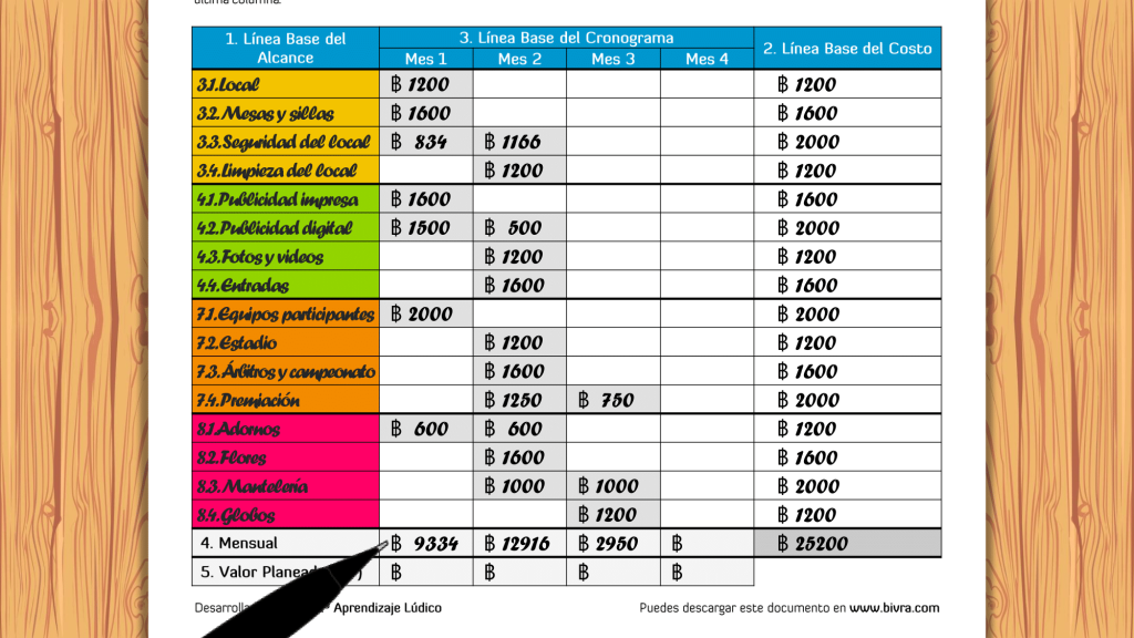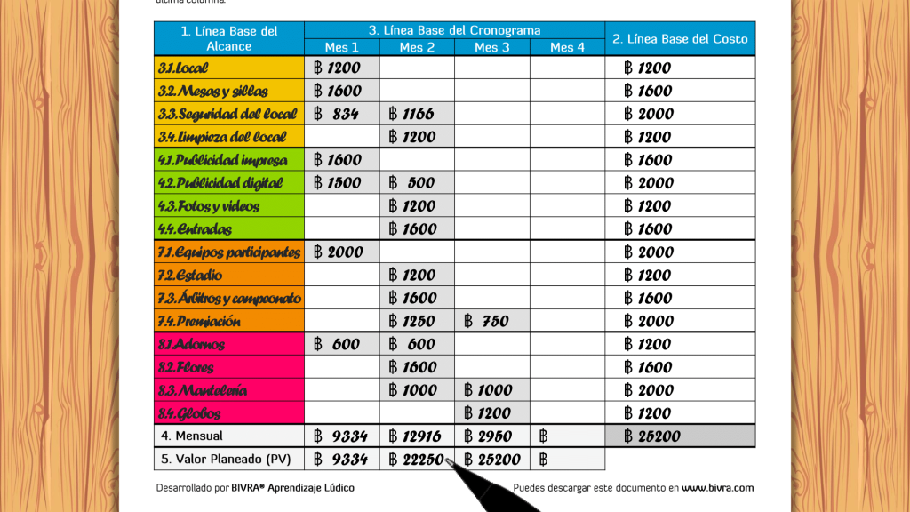 - Línea Base de Costos: Versión aprobada de la estimación de costos de todos los recursos necesarios para el proyecto, incluyendo personal, materiales, equipamiento, servicios, instalaciones, entre otros (PMI, 2017).