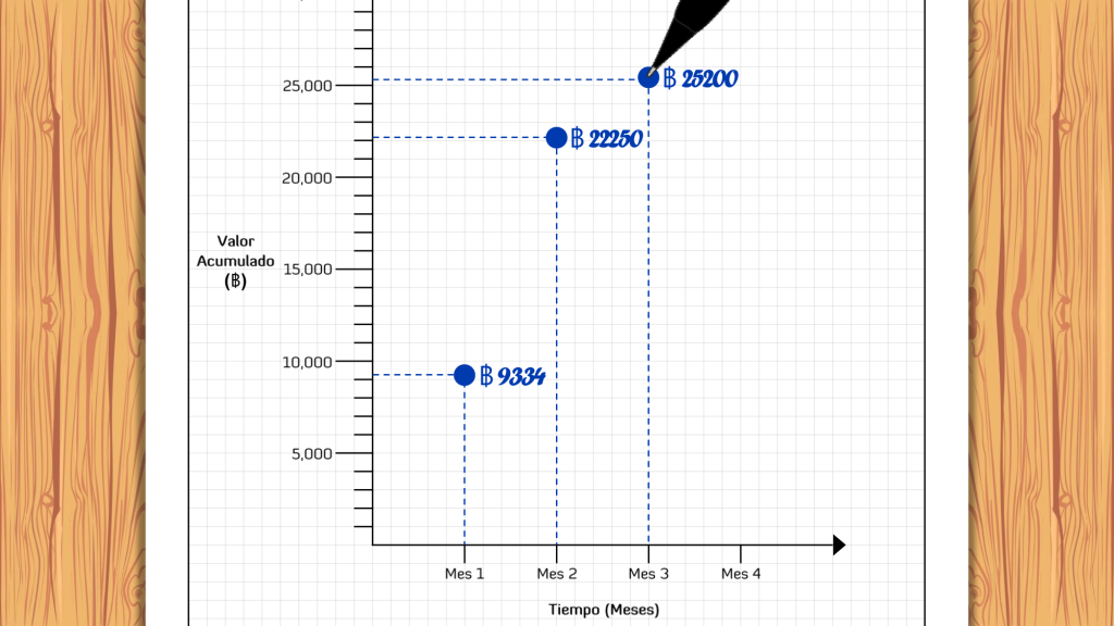Para poder elaborar esta representación de la Línea Base de Medición del Desempeño (PMB), deben haber completado previamente la Representación Tabular, ya que necesitas el Valor Planeado (PV) de cada mes. En este gráfico en el eje horizontal o eje X se ubica el Tiempo y en el eje vertical o eje Y el Valor Acumulado; ubica los puntos: