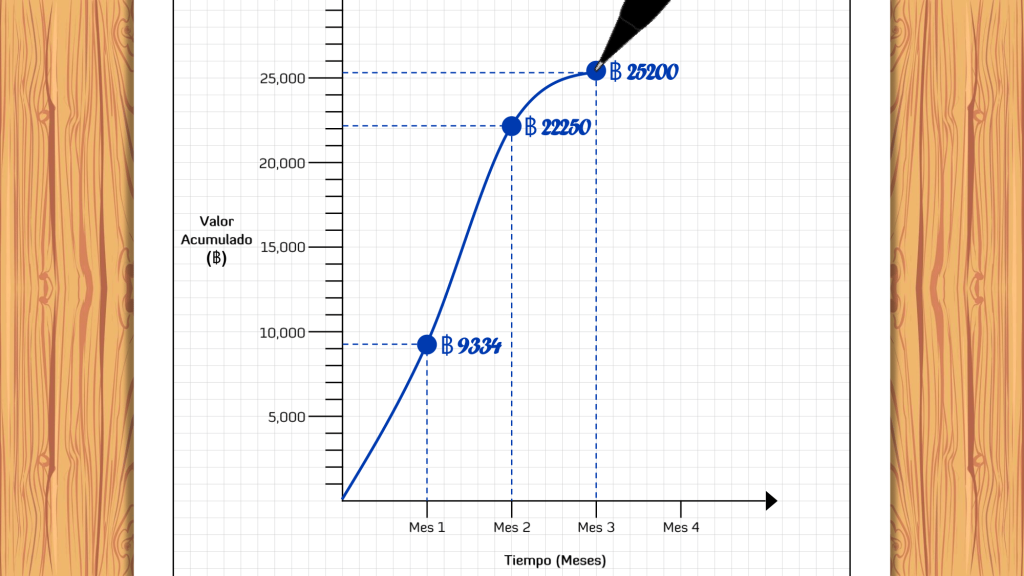 Luego, traza la Curva del Valor Planeado (PV) uniendo todos los puntos e iniciando el trazo desde el origen de coordenadas (0, 0).